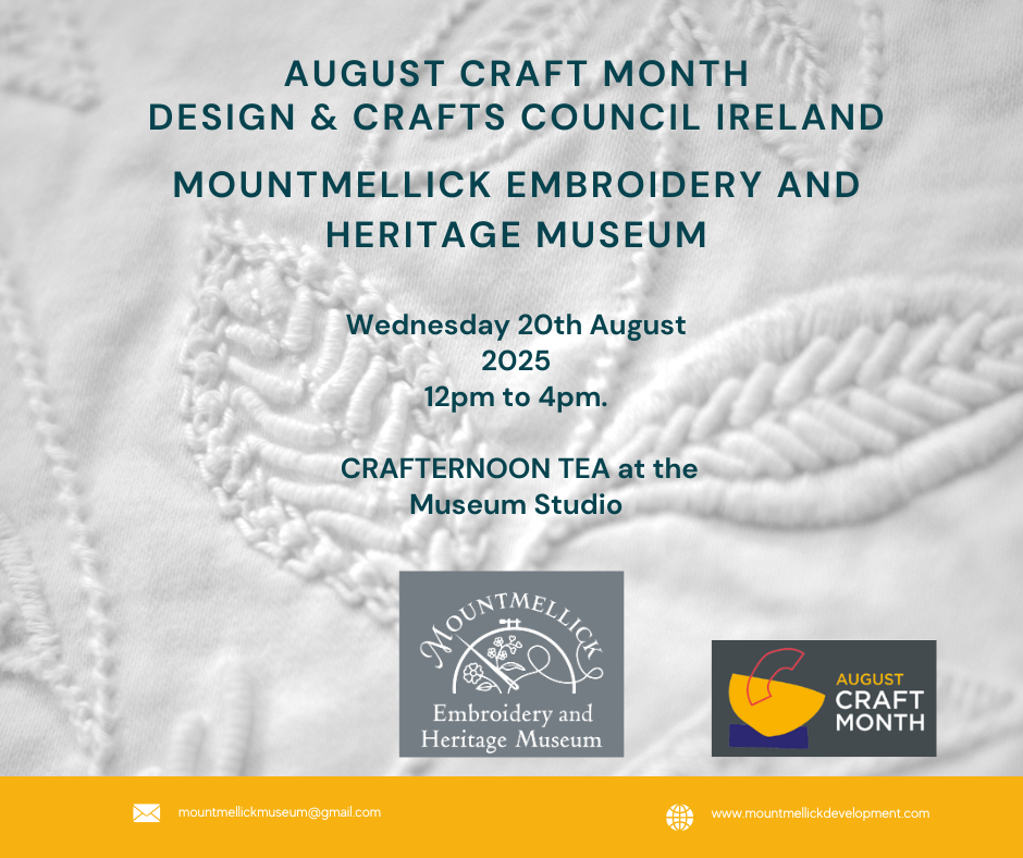 In celebration of August Craft Month, the Mountmellick Development Association warmly invites you to enjoy an afternoon of creativity and culture at the Museum Studio, highlighting the rich tradition of Mountmellick Embroidery.