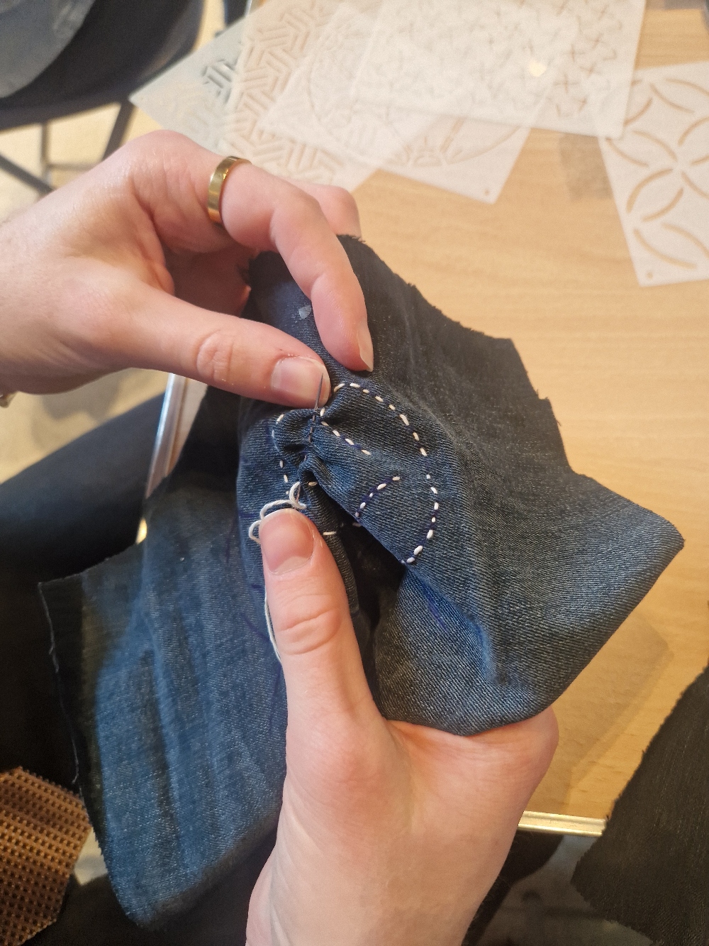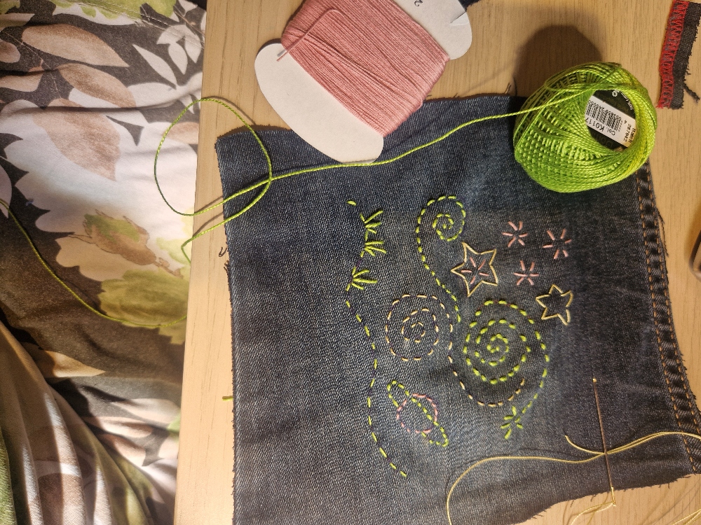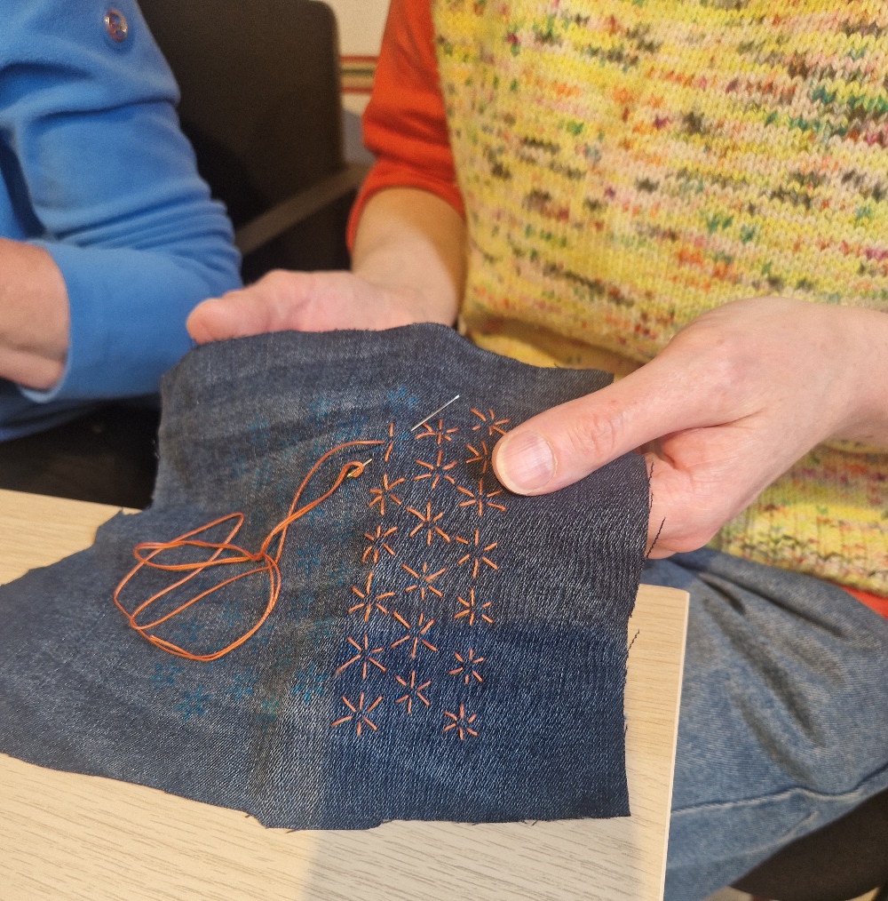 Each participant will learn to stitch a Sashiko pattern on a scrap of denim. I will also show how to repair a hole or cover a stain. When the basics have been mastered, we can work on jeans etc that people have brought to the workshop.
